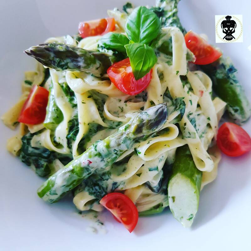 2. Schil ondertussen de asperges en snij ze in 4 stukken en hou de kopjes even apart.