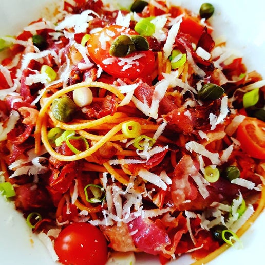 7. Neem een diep bord en doe er de pasta in. Verdeel er wat stukjes pancetta, Geraspte pecorino, wat fijn gesneden lente-ui en een paar gehalveerde kersttomaatjes over.